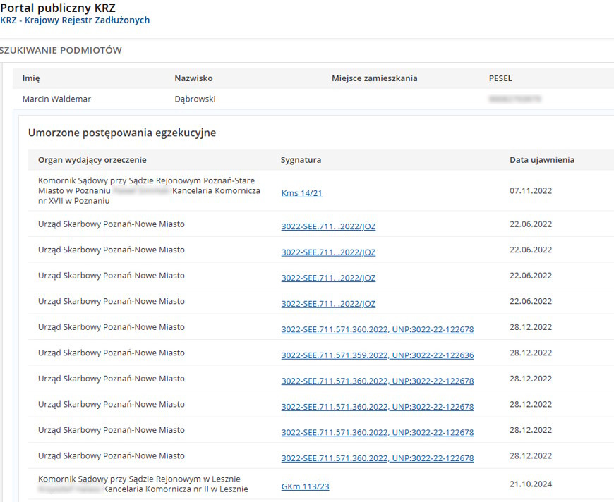 Podkreślenia wymaga, że powyższe informacje zostały zebrane z publicznie dostępnych rejestrów oraz z doniesień mediów. Nie dają one pełnego kontekstu sytuacji, w szczególności w zakresie zdarzeń biznesowych, które mogły prowadzić do uwidocznienia w tych rejestrach konkretnych informacji. Dane te nie są dostateczną przesłanką do przypisywania komukolwiek woli naruszenia powszechnie obowiązujących przepisów prawa, chyba że bezpośrednio to z nich wynika (np. w zakresie wyroków sądów karnych).