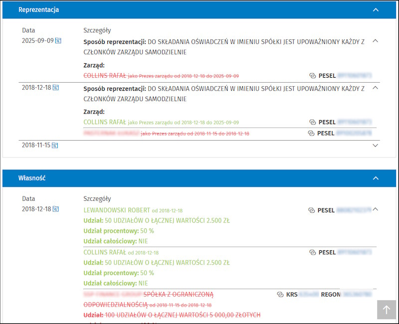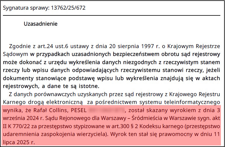 Na podstawie analizy wykreśleń Rafała Collinsa w innych spółkach ustaliliśmy, że został on skazany za przestępstwo udaremnienia zaspokojenia wierzyciela z art. 300 § 2 Kodeksu karnego. Więcej o tej historii piszemy w kolejnym artykule.