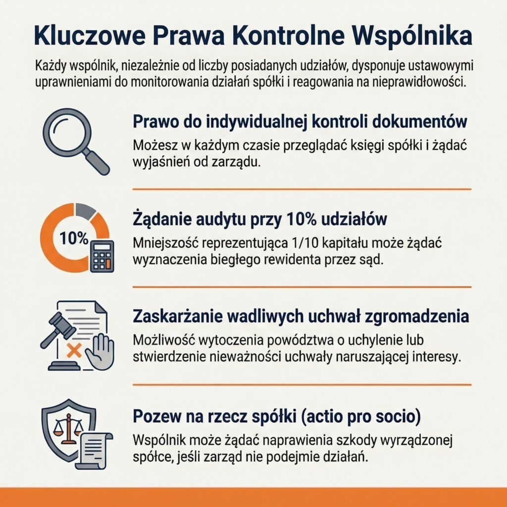 Wspólnik spółki ma możliwości wynikające z Kodeksu spółek handlowych, czasem rozbudowane, a czasem ograniczone umową spółki jak i jej strukturą (np. wolą pozostałych wspólników). Wspólnik spółki może w każdym czasie przeglądać księgi i dokumenty spółki, a także żądać wyjaśnień od zarządu (art. 212 k.s.h.). Jeśli zarząd wyrządził spółce szkodę wspólnik może pozwać taką osobę (art. 295 w zw. z art. 293 k.s.h.). Jeśli wspólnik nie może osiągnąć porozumienia z innymi wspólnikami odnośnie do likwidacji spółki, może wystąpić o to do sądu (art. 271 k.s.h.).