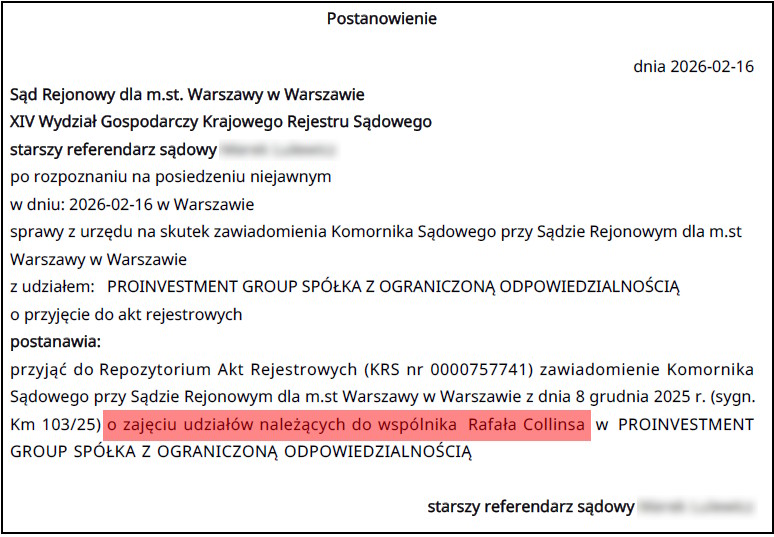 W 2022 r. przed Sądem Rejonowym dla Warszawy-Śródmieścia w Warszawie rozpoczyna się postępowanie karne przeciwko Rafałowi Collinsowi. W 2024 r. zostaje on skazany za jedno z przestępstw, o którym mowa w art. 18 § 2 Kodeksu spółek handlowych. W efekcie w 2025 r. zostaje on wykreślony z zarządu spółki Proinvestment Group. Od tego czasu spółka nie ma zarządu.