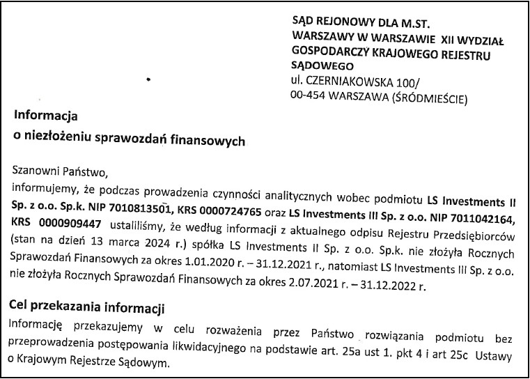 W marcu 2024 r. urząd skarbowy skierował do sądu pismo z propozycją rozważenia rozwiązania z urzędu spółek LS Investments II sp. z o.o. sp. k. (KRS: 0000724765) oraz LS Investments III sp. z o.o. (KRS: 0000909447) w związku z nieskładaniem przez nie sprawozdań finansowych. W obydwu tych spółkach Robert Lewandowski jest beneficjentem rzeczywistym4. Po piśmie z urzędu pierwsza z tych spółek złożyła zaległe sprawozdania (do 2023 r. włącznie, nowszych sprawozdań brak). Druga z nich nie.