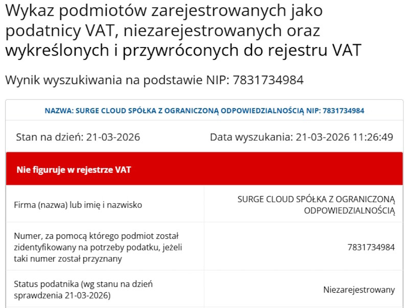Surge Cloud nie jest jedyną spółką, z którą powiązane są ww. osoby. Mikołaj Pawlak od 2022 r. jest prezesem spółki VLP PO sp. z o.o., wobec której w KRZ ujawniono w 2025 r. cztery bezskuteczne egzekucje na ponad 150 tys. zł. Marcin Dąbrowski od 2015 r. jest prezesem spółki SurgeBeacon sp. z o.o., wobec której ujawniono w KRZ jedną bezskuteczną egzekucję na… 67,44 zł. Nieprawomocnym postanowieniem z 20.02.2026 r. poznański sąd z urzędu rozwiązał SurgeBeacon sp. z o.o. i zarządził jej wykreślenie z Krajowego Rejestru Sądowego ustalając, że nie ma ona majątku i nie prowadzi działalności.