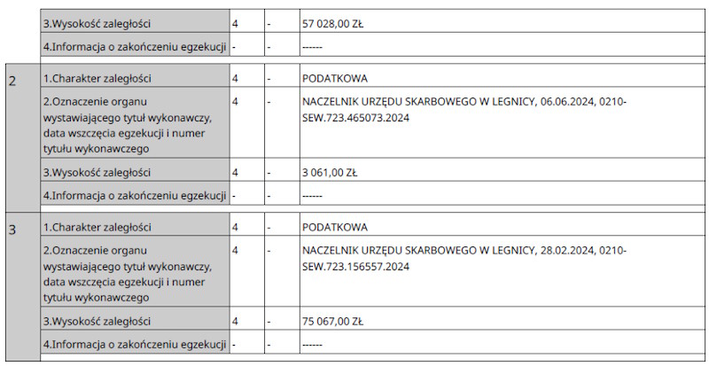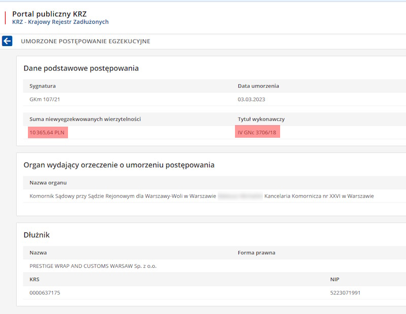 Zrzut ekranu z Krajowego Rejestru Zadłużonych