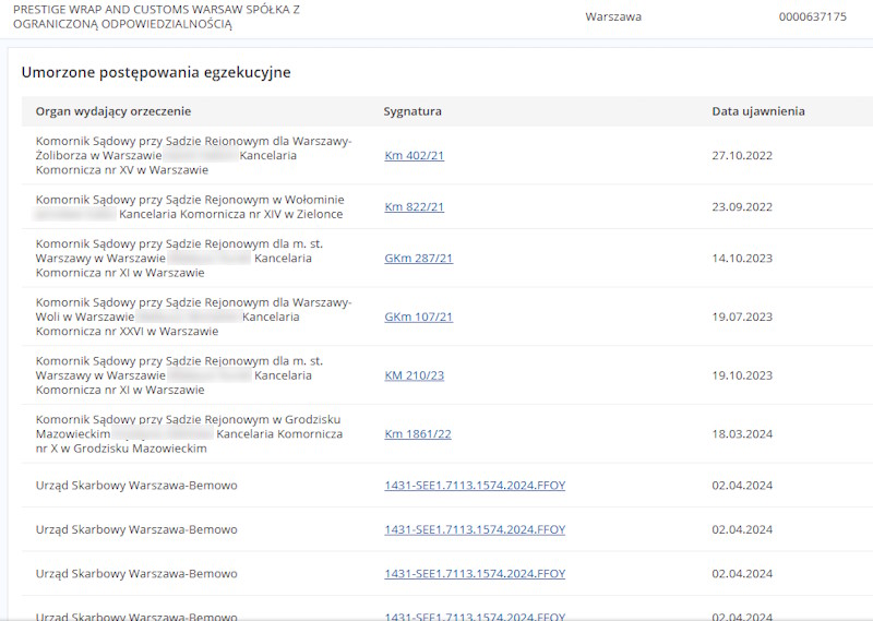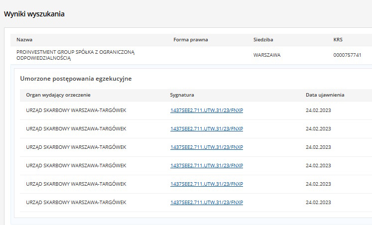 Już w 2018 r. zostaje wytoczone przeciwko spółce pierwsze postępowanie sądowe o zapłatę. Sprawa w 2021 r. trafia do egzekucji, a w 2023 r. zostaje umorzona w związku z jej bezskutecznością. Jest to jedno z szeregu postępowań egzekucyjnych ujawnionych w stosunku do spółki w Krajowym Rejestrze Zadłużonych.