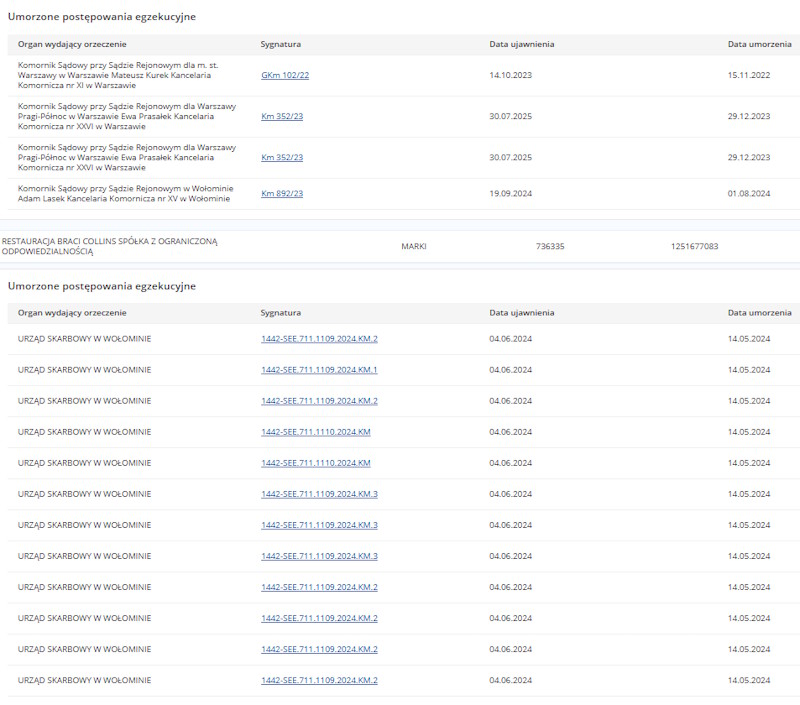 Ponadto w Krajowym Rejestrze Zadłużonych zostaje ujawniona bezskuteczna egzekucja wobec Rafała Collinsa na kwotę 81.817,66 zł (sygn. Km 1462/24).