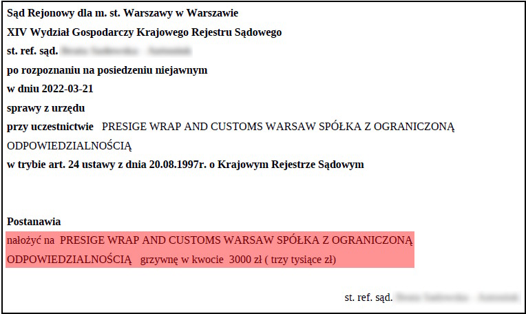 Grzywna nałożona na spółkę w związku z brakiem sprawozdania
