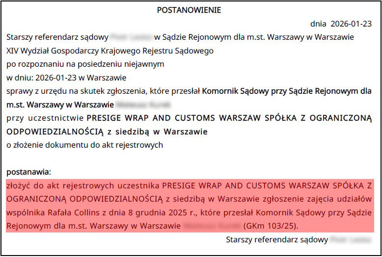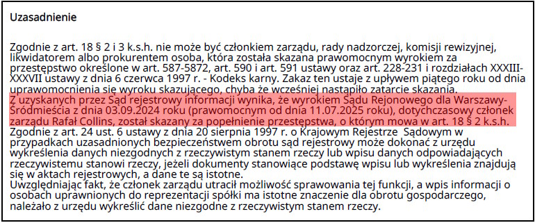 We wrześniu 2025 r. Rafał Collins zostaje z urzędu (z inicjatywy sądu) wykreślony jako członek zarządu spółki w związku ze skazaniem go wyrokiem karnym. W grudniu 2025 r. warszawski komornik zajmuje udziały Rafała Collinsa w spółce. Dlaczego Rafał Collins został skazany wyrokiem sądu karnego? Tego dotyczy dalsza część historii.