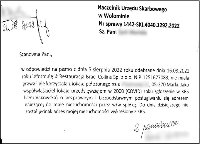 Spółka od momentu swojej rejestracji miała siedzibę w miejscowości Marki pod konkretnym adresem. Adres ten wykreślono z rejestru przedsiębiorców KRS w 2023 r. Przeanalizowaliśmy akta rejestrowe spółki, w których znaleźliśmy pismo wysłane do urzędu skarbowego przez właściciela nieruchomości, pod adresem której zarejestrowana była spółka. W piśmie tym współwłaściciel nieruchomości pisze, że już w okresie pandemii zawiadomił sąd o „bezprawnym i bezpodstawnym posługiwaniu się adresem należącej do mnie nieruchomości przez w/w spółkę”.