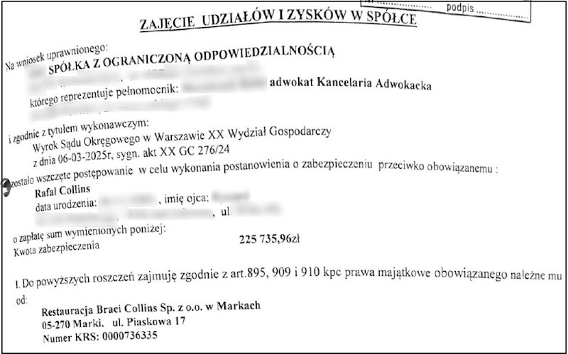 Zobowiązania zaczynają mieć nie tylko spółki, ale również Rafał Collins jako osoba fizyczna. Jego udziały w spółkach zajmuje komornik w związku z postępowaniem zabezpieczającym na kwotę 225.735 zł. Należy przy tym podkreślić, że zabezpieczenie roszczenia ma miejsce w toku sprawy (nie ma jeszcze ostatecznego wyroku). W opisywanym przypadku podstawą był nieprawomocny wyrok sądu I instancji w postępowaniu gospodarczym.