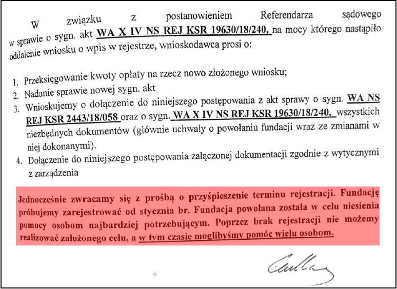 Fragment pisma z 16.07.2018 r. z akt rejestrowych fundacji