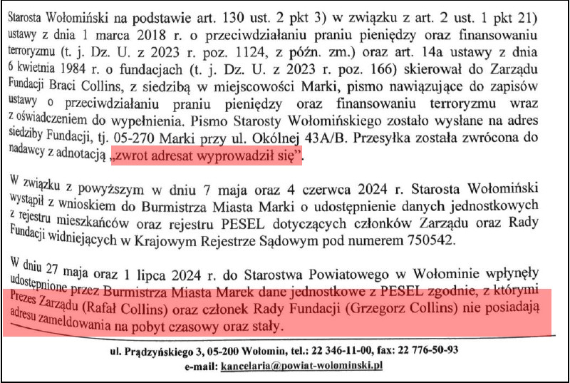 We wrześniu 2024 r. Starostwa Wołomiński informuje sąd, że nie może wyegzekwować od fundacji wypełnienia dokumentów wynikających z ustawy o przeciwdziałaniu praniu pieniędzy oraz finansowaniu terroryzmu w związku z tym, że kierowane przez niego pisma (zarówno na adres rejestrowy jak i ze strony www fundacji) wracają niepodjęte. Starosta informuje również sąd, że Rafał i Grzegorz Collins nie posiadają adresu zameldowania na pobyt czasowy oraz stały. Sąd postanawia o wykreśleniu adresu rejestrowego fundacji18.