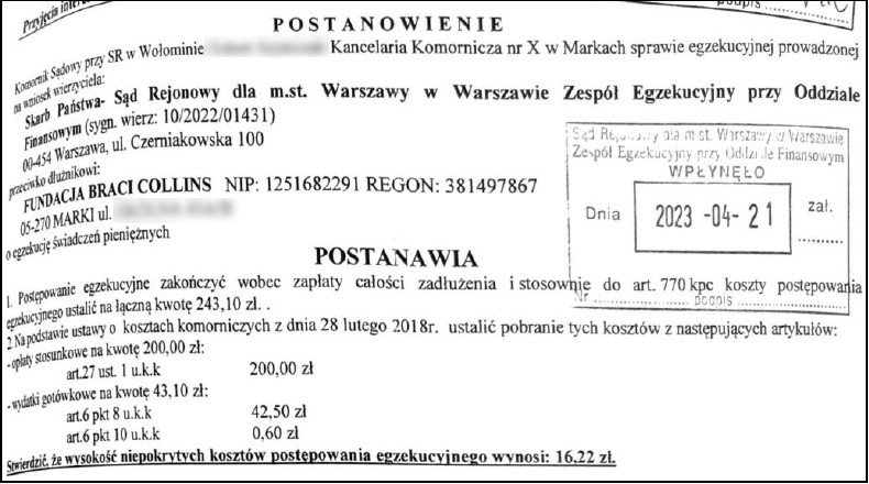 Fundacja z opóźnieniem (w 2021 r.) składa sprawozdania finansowe za 2018 i 2019 rok. W maju 2022 r. sąd wszczyna postępowanie przymuszające, w celu złożenia sprawozdania za 2020 r. Po dwukrotnej grzywnie w kwocie 1.000 zł i 6000 zł16 do KRS zostają przesłane zaległe sprawozdania za 2020 i 2021 r. Są to ostatnie złożone dokumenty finansowe. Nie pomaga nawet wniosek Prokuratury Rejonowej w Wołominie z maja 2024 r. o wszczęcie postępowania przymuszającego w sprawie sprawozdania za 2022 r.17 Wspomniana wyżej grzywna w kwocie 1.000 zł zostaje wyegzekwowana przez komornika.